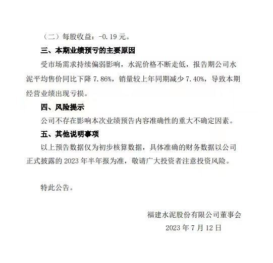 福建水泥7月11日公告,預計2023年上半年凈虧1.33億元。受市場需求持續偏弱影響,水泥價格不斷走低,報告期公司水泥平均售價同比下降7.86%,銷量較上年同期減少7.4%,導致本期經營業績出現虧損。
